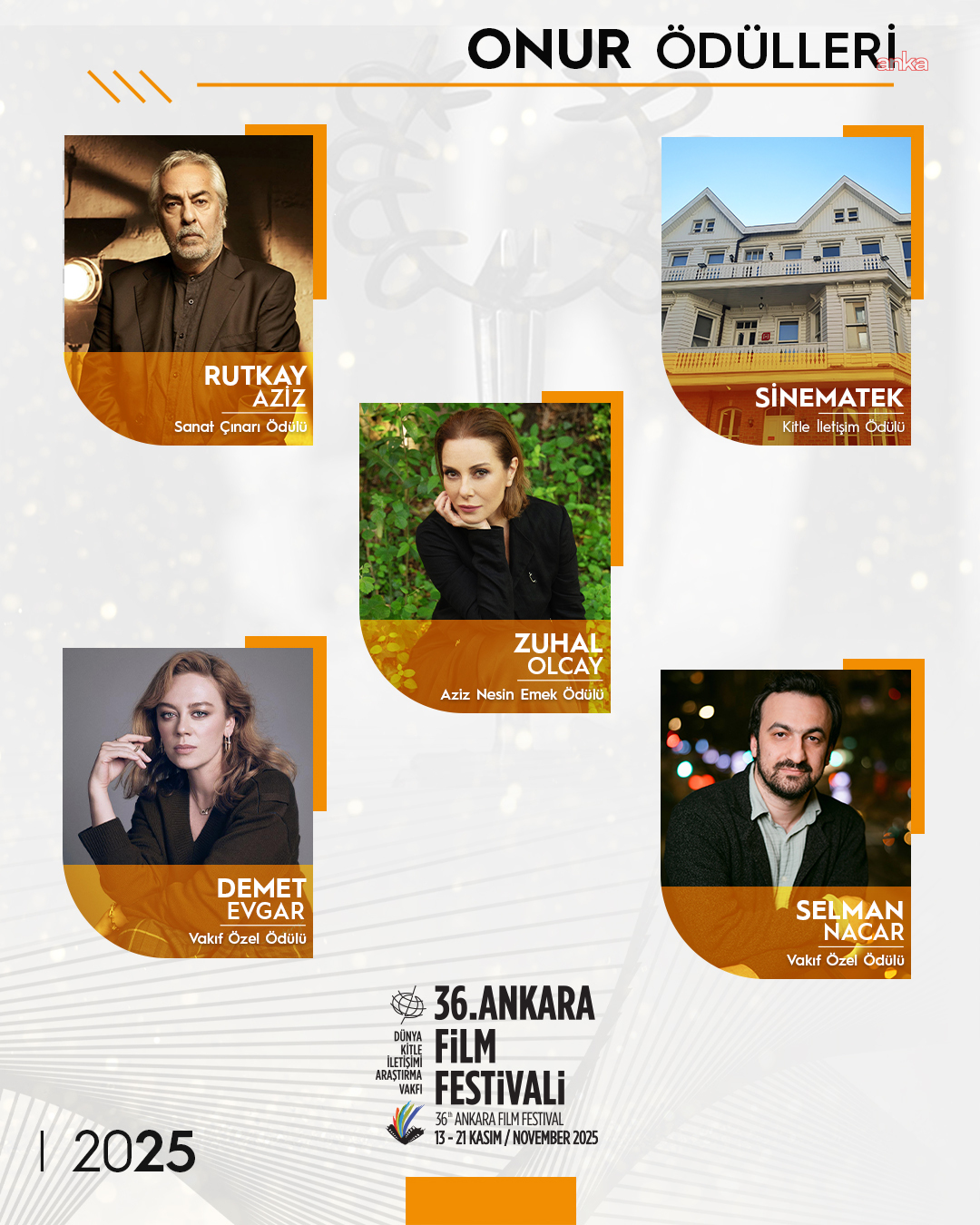 Dünya Kitle İletişimi Araştırma Vakfı tarafından 13–21 Kasım 2025 tarihlerinde düzenlenecek 36. Ankara Film Festivalinin Onur Ödülleri belli oldu. Bu yıl Aziz Nesin Emek Ödülü tiyatro, sinema ve müzikteki çok yönlü üretimiyle Zuhal Olcay’a; Sanat Çınarı Ödülü tiyatro sahnesindeki öncü çalışmaları ve sinemaya katkılarıyla Rutkay Aziz’e verilecek.