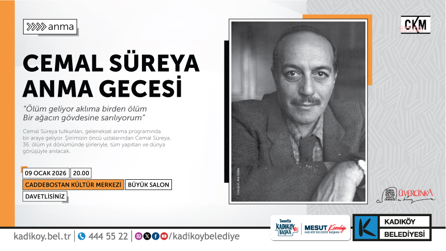 Türk şiirinin usta isimlerinden Cemal Süreya, Kadıköy Belediyesi Caddebostan Kültür Merkezi’nde şiir, tiyatro, müzik ve söyleşinin bir araya geldiği geceyle anılacak. Cemal Süreya’nın edebiyata, dile ve kültüre bıraktığı izlerin farklı disiplinler aracılığıyla yeniden yorumlanacağı programın sunuculuğunu Övünç Ezgi Yılmaz üstlenecek. Gecenin açılış konuşmasını yapacak Seyyit Nezir, Süreya’nın şiir dünyasını ve kuşağıyla kurduğu ilişkiyi ele alacak.