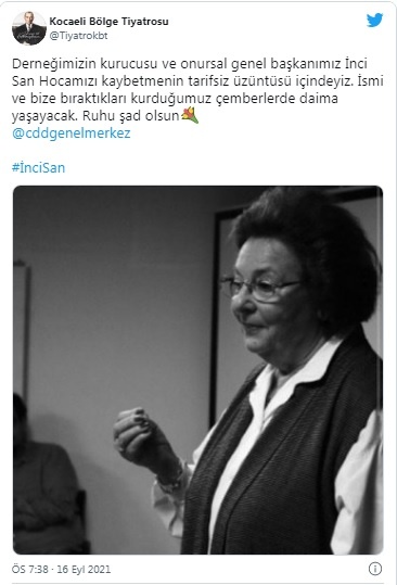 San’ın vefat haberinin ardından Kocaeli Bölge Tiyatrosu’nun sosyal medya hesabından yapılan paylaşımında, “Derneğimizin kurucusu ve onursal genel başkanımız İnci San Hocamızı kaybetmenin tarifsiz üzüntüsü içindeyiz. İsmi ve bize bıraktıkları kurduğumuz çemberlerde daima yaşayacak. Ruhu şad olsun” ifadeleri kullanıldı.