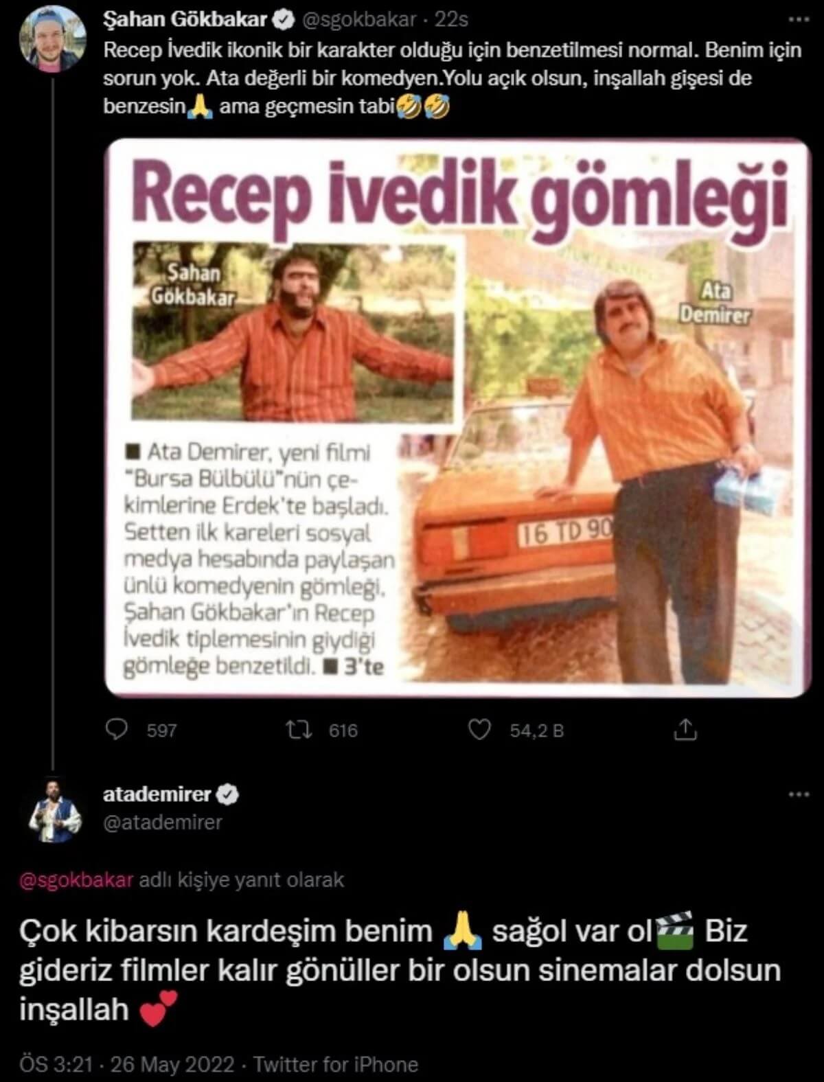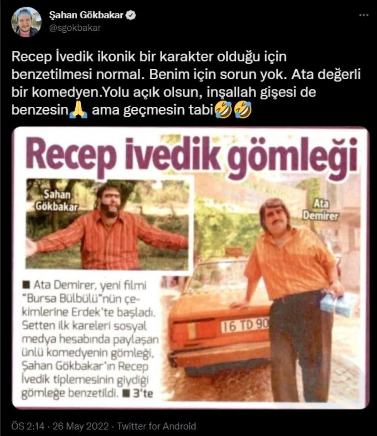 Ünlü komedyen Şahan Gökbakar da, benzetmenin ardından, Twitter hesabından “Recep İvedik ikonik bir karakter olduğu için benzetilmesi normal. Benim için sorun yok. Ata değerli bir komedyen. Yolu açık olsun, inşallah gişesi de benzesin. Ama geçmesin tabii” yazdı.