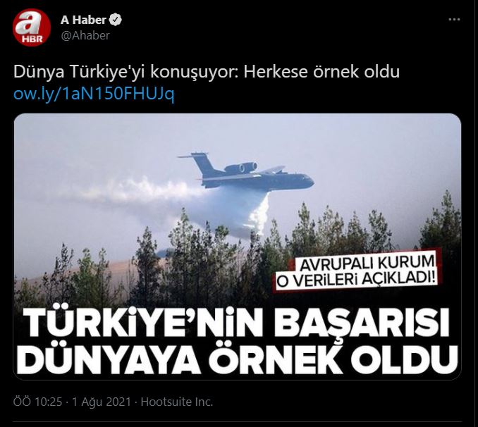 Türkiye’nin ormanları cayır cayır yanarken, insanlar ve yabani hayvanlar yaşamlarını yitirirken, yangın söndürme uçaklarının bilinçli olarak tasfiyesi gündemi meşgul ederken ahaber, internet sitesinde Türkiye’nin yangınlarla mücadelede dünya lideri olduğunu kurguladığı bir haberi yayına alıp servis etti.