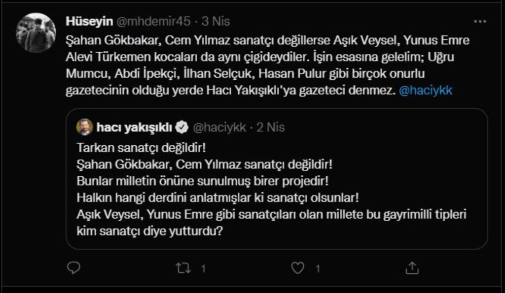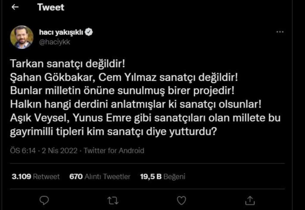 Akit gazetesinin Ankara temsilcisi Hacı Yakışıklı, ekonomik kriz, çevre sorunları, yolsuzluk gibi toplumu ilgilendiren konulara tepki gösterdikleri için Tarkan, Şahan Gökbakar ve Cem Yılmaz’ı hedef aldı. Ancak Yakışıklı, sanatçıları hedef alırken Yunus Emre’den ve Aşık Veysel’den ‘sanatçı’ diye söz etti.