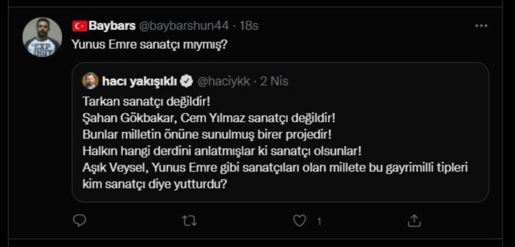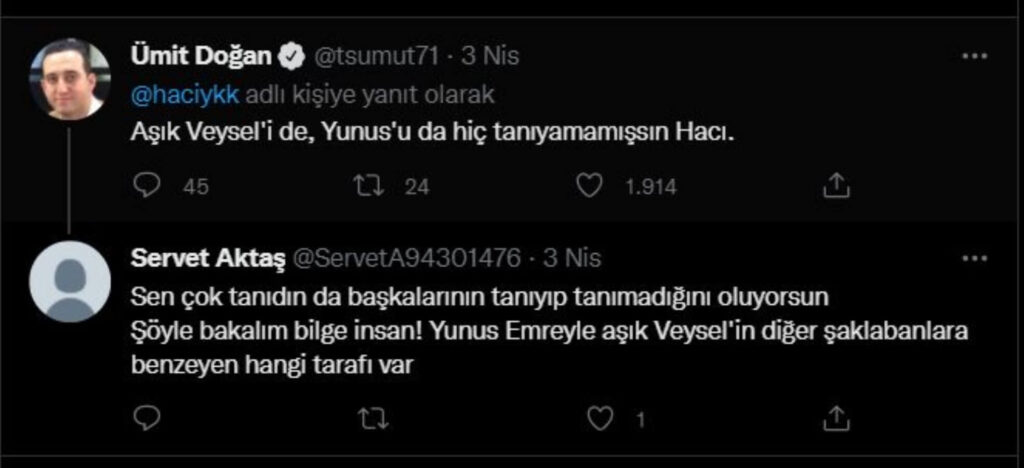 Akit’in temsilcisi Hacı Yakışıklı’nın bu kez de Anadolu’da yaşayan, Türkçe şiirin öncüsü büyük ozan ve halk şairi Yunus Emre’den ‘sanatçı’ diye bahsettiği ortaya çıktı. Yakışıklı’nın iletisini gören yurttaşlar tepki gösterdi.