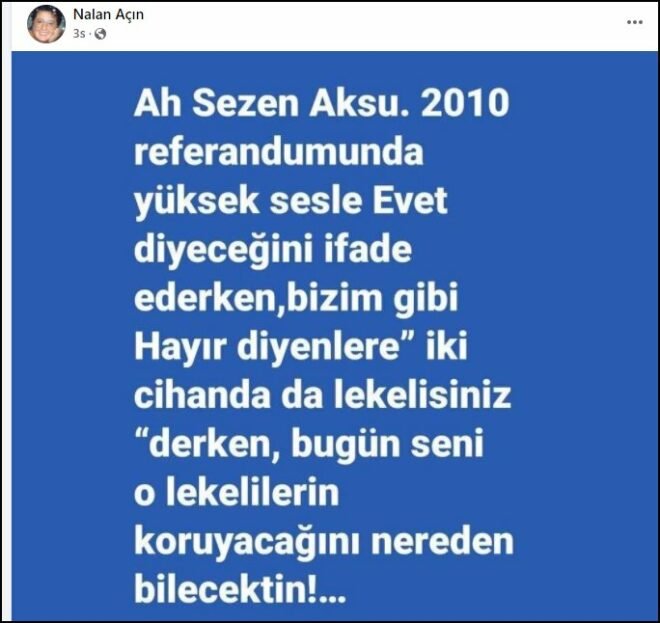 Akrep Nalan lakabıyla bilinen Nalan Açın, 5 yıl önce yazdığı şarkı sözleri nedeniyle hedef gösterilen Sezen Aksu’ya tepki gösterdi. Açın, Facebook hesabından yaptığı paylaşımda 2010 yılında gerçekleştirilen referandum oylamasını hatırlattı. Açın paylaşımında “Ah Sezen Aksu. 2010 referandumunda yüksek sesle ‘Evet’ diyeceğini ifade ederken, bizim gibi ‘Hayır’ diyenlere, ‘İki cihanda da lekelisiniz’ derken bugün seni o lekelilerin koruyacağını nereden bilecektin” ifadelerini kullandı.
