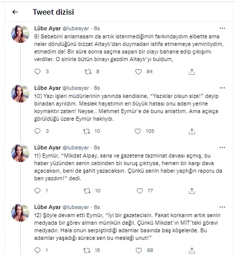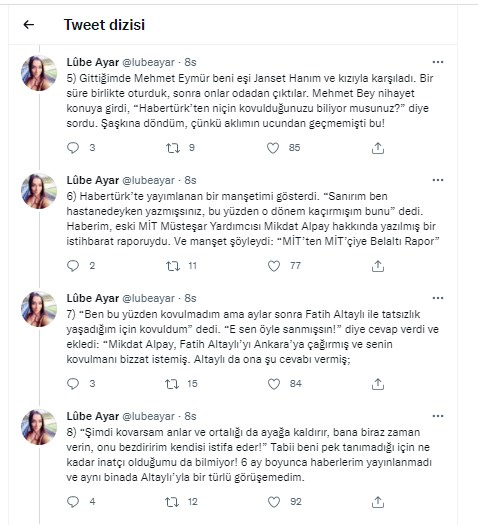 7) “Ben bu yüzden kovulmadım ama aylar sonra Fatih Altaylı ile tatsızlık yaşadığım için kovuldum” dedi. “E sen öyle sanmışsın!” diye cevap verdi ve ekledi: “Mikdat Alpay, Fatih Altaylı’yı Ankara’ya çağırmış ve senin kovulmanı bizzat istemiş. Altaylı da ona şu cevabı vermiş;