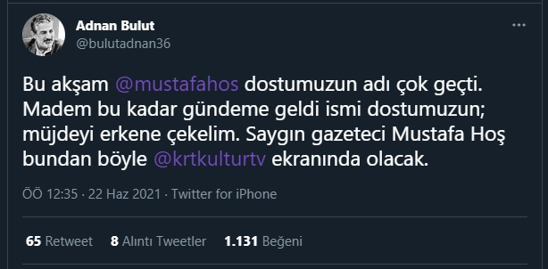 Bu akşam @mustafahos dostumuzun adı çok geçti. Madem bu kadar gündeme geldi ismi dostumuzun; müjdeyi erkene çekelim. Saygın gazeteci Mustafa Hoş bundan böyle @krtkulturtv ekranında olacak.