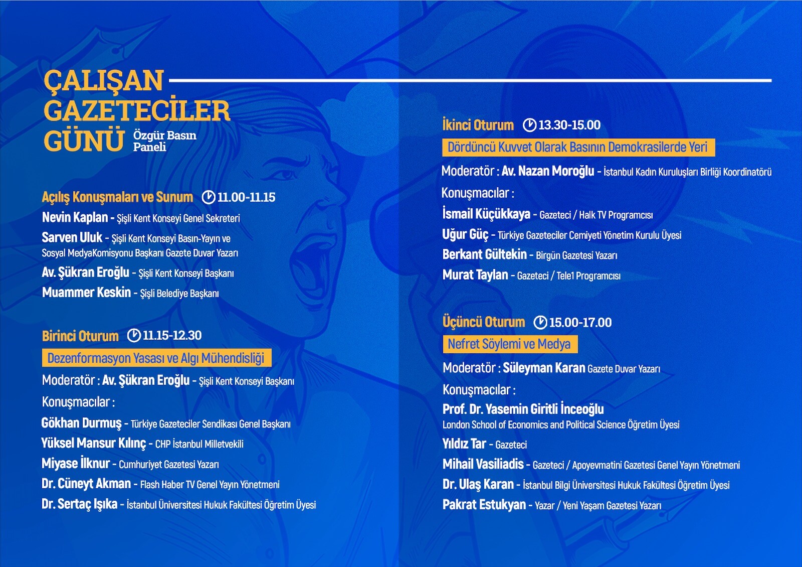 Halk TV Programcısı, Gazeteci İsmail Küçükkaya, Türkiye Gazeteciler Cemiyeti Yönetim Kurulu Üyesi Uğur Güç, Birgün Gazetesi Yazarı Berkant Gültekin ve Tele1 Programcısı Gazeteci Murat Taylan’ın konuşmacı olarak katılacaktır.