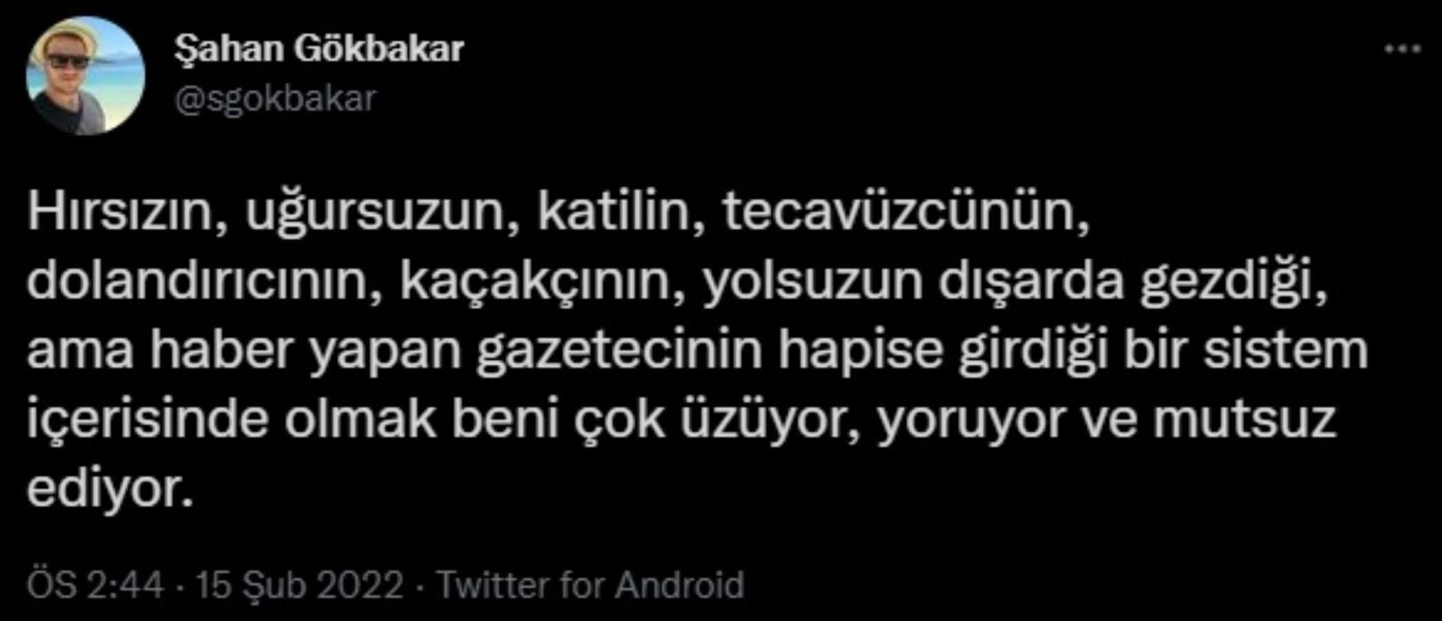 “Hırsızın, uğursuzun, katilin, tecavüzcünün, dolandırıcının, kaçakçının, yolsuzun dışarıda gezdiği ama haber yapan gazetecinin hapse girdiği bir sistem içerisinde olmak beni çok üzüyor, yoruyor ve mutsuz ediyor.”