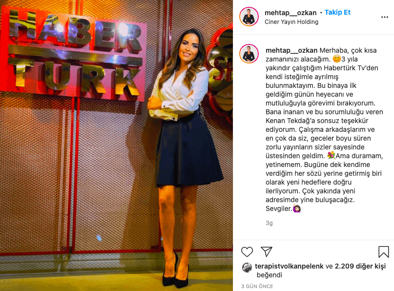 “Merhaba, çok kısa zamanınızı alacağım. ?? 3 yıla yakındır çalıştığım Habertürk Tv’den kendi isteğimle ayrılmış bulunmaktayım. Bu binaya ilk geldiğim günün heyecanı ve mutluluğuyla görevimi bırakıyorum. Bana inanan ve bu sorumluluğu veren Kenan Tekdağ’a sonsuz teşekkür ediyorum.