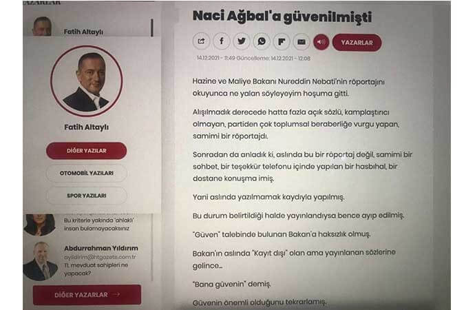 Altaylı’nın bu iddiayı ortaya atan yazısı daha sonra Habertürk’ün sitesinden kaldırıldı. Altaylı, kaldırılan yazısında şu ifadeleri kullanmıştı: