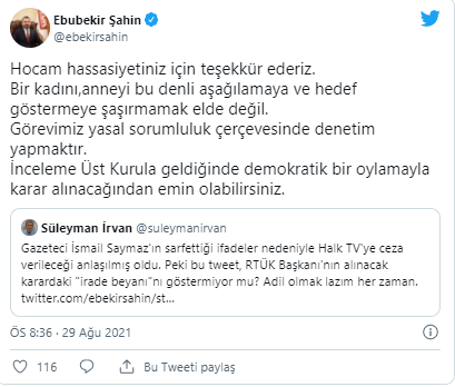 Öte yandan bir paylaşım daha yapan Ebubekir Şahin, kendisinin ‘inceleme başlatıldı’ ifadesine ilişkin bir paylaşım yapan Süleyman İrvan’a “Hocam hassasiyetiniz için teşekkür ederiz. Bir kadını,anneyi bu denli aşağılamaya ve hedef göstermeye şaşırmamak elde değil. Görevimiz yasal sorumluluk çerçevesinde denetim yapmaktır. İnceleme Üst Kurula geldiğinde demokratik bir oylamayla karar alınacağından emin olabilirsiniz.” yanıtını verdi.