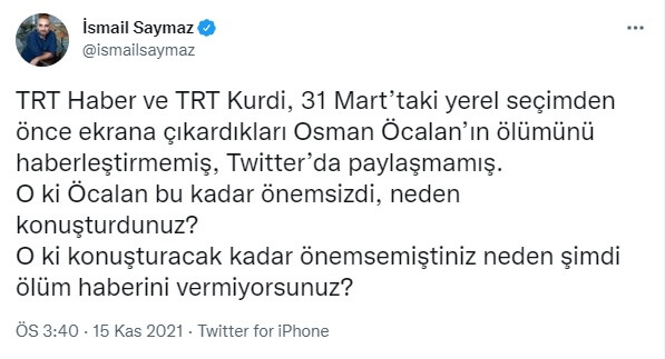 Gazeteci İsmail Saymaz, TRT Haber ve TRT Kurdî’nin 31 Mart’taki yerel seçimden önce ekrana çıkardıkları Fethullah Gülen’in kardeşi Osman Öcalan’ın ölümünü haberleştirmemesi ve Twitter’da paylaşmamasına dikkati çekti.