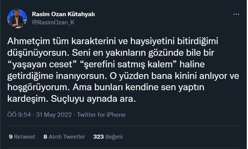 Bunun üzerine Rasim Ozan Kütahyalı sosyal medya hesabından Ahmet Hakan’ı hedef alarak “Ahmetçim tüm karakterini ve haysiyetini bitirdiğimi düşünüyorsun. Seni en yakınların gözünde bile bir ‘yaşayan ceset’, ‘şerefini satmış kalem’ haline getirdiğime inanıyorsun. O yüzden bana kinini anlıyor ve hoşgörüyorum. Ama bunları kendine sen yaptın kardeşim. Suçluyu aynada ara.” açıklamasını yapmıştı.