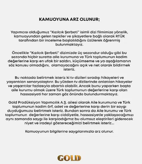 Yapımcı Gold Yapım ise resmi sosyal medya hesabından yaptığı açıklamada, incelemenin üzüntüyle karşılandığını belirterek, “Bundan sonra aile kurumuna ve Türk toplumunun değerlerine karşı ciddiyetle, hassasiyetle yaklaşacağımızı, aynı zamanda olumsuz eleştirileri giderecek niyet ve iradeyi göstereceğimizi belirtmek isteriz” ifadelerini kullandı.