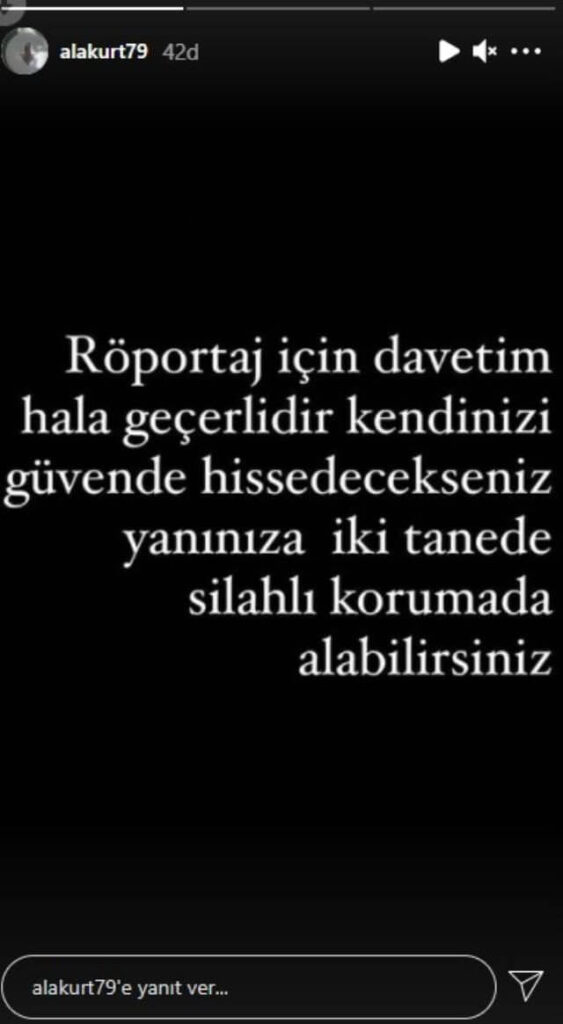 Antalya’da yaşadığı yönündeki haberleri yalanlayan Alakurt, “Brezilya ne zaman Antalya oldu veletler?” diyerek tepki gösterdi. Oyuncu diğer paylaşımlarında ise peş peşe tehditler savurdu. Hakkında haber yapan bir kurumu hedef alan Alakurt, “Röportaj için davetim hala geçerlidir. Kendinizi güvende hissedecekseniz yanınıza iki tane silahlı koruma da alabilirsiniz. Ama dua edin bir gün canım sıkılıp da davete karşılık vermediğiniz için kafamdaki listeyle beraber ben röportaja gelmeyeyim” dedi.