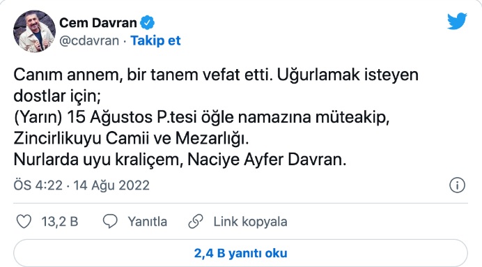 Cem Davran, haberi sosyal medya hesabından duyurdu. Annesinin cenaze töreni bilgilerini de paylaşan Cem Davran, ”Canım annem, bir tanem vefat etti” ifadelerini kullandı. Davran’ın paylaşımına aralarında Songül Öden, Behzat Uygur, Demet Evgar gibi ünlü isimlerin de olduğu çok sayıda takipçisinden baş sağlığı mesajları yağdı.