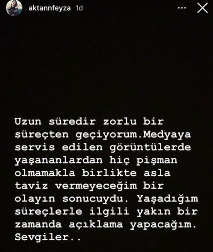 “Uzun süredir zorlu bir süreçten geçiyorum. Medyaya servis edilen görüntülerde yaşananlardan hiç pişman olmamakla birlikte asla taviz vermeyeceğim bir olayın sonucuydu. Yaşadığım süreçlerle ilgili yakın bir zamanda açıklama yapacağım. Sevgiler”