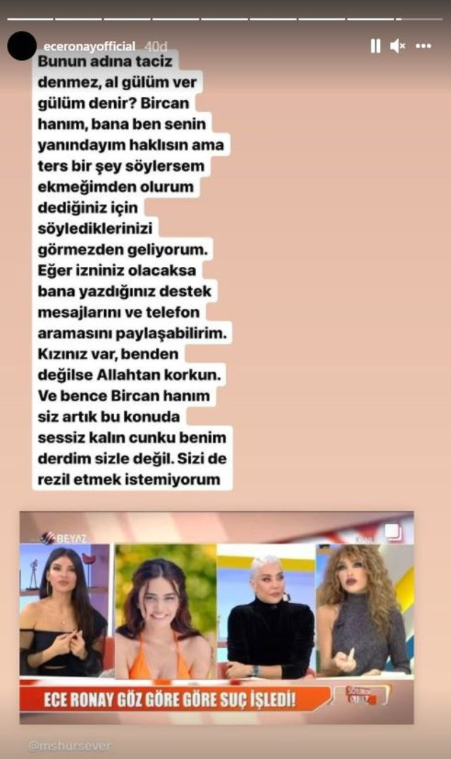 Ece Ronay bu anları paylaşarak “Kızınız var benden değilse Allah’tan korkun. Ve bence Bircan Hanım siz artık bu konuda sessiz kalın çünkü benim derdim sizinle değil. Sizi de rezil etmek istemiyorum” dedi.