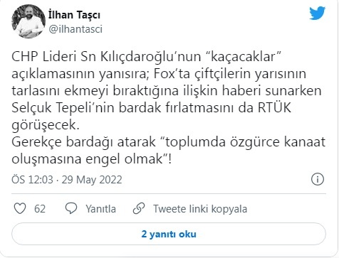 “CHP Lideri Sn Kılıçdaroğlu’nun “kaçacaklar” açıklamasının yanısıra; Fox’ta çiftçilerin yarısının tarlasını ekmeyi bıraktığına ilişkin haberi sunarken Selçuk Tepeli’nin bardak fırlatmasını da RTÜK görüşecek. Gerekçe bardağı atarak ‘toplumda özgürce kanaat oluşmasına engel olmak’!”