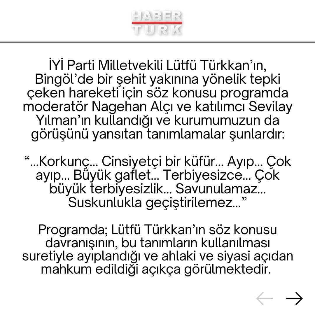 İYİ Parti Grup Başkanvekili Lütfü Türkkan, şehit abisine küfretti. Tüm Türkiye ayağa kalktı. İYİ Parti, Türkkan'ı Grup Başkanvekili görevinden aldı. Habertürk yazarı Sevilay yılman ise 'İstanbul Beyefendisi' dediği Türkkan'a sahip çıktı.