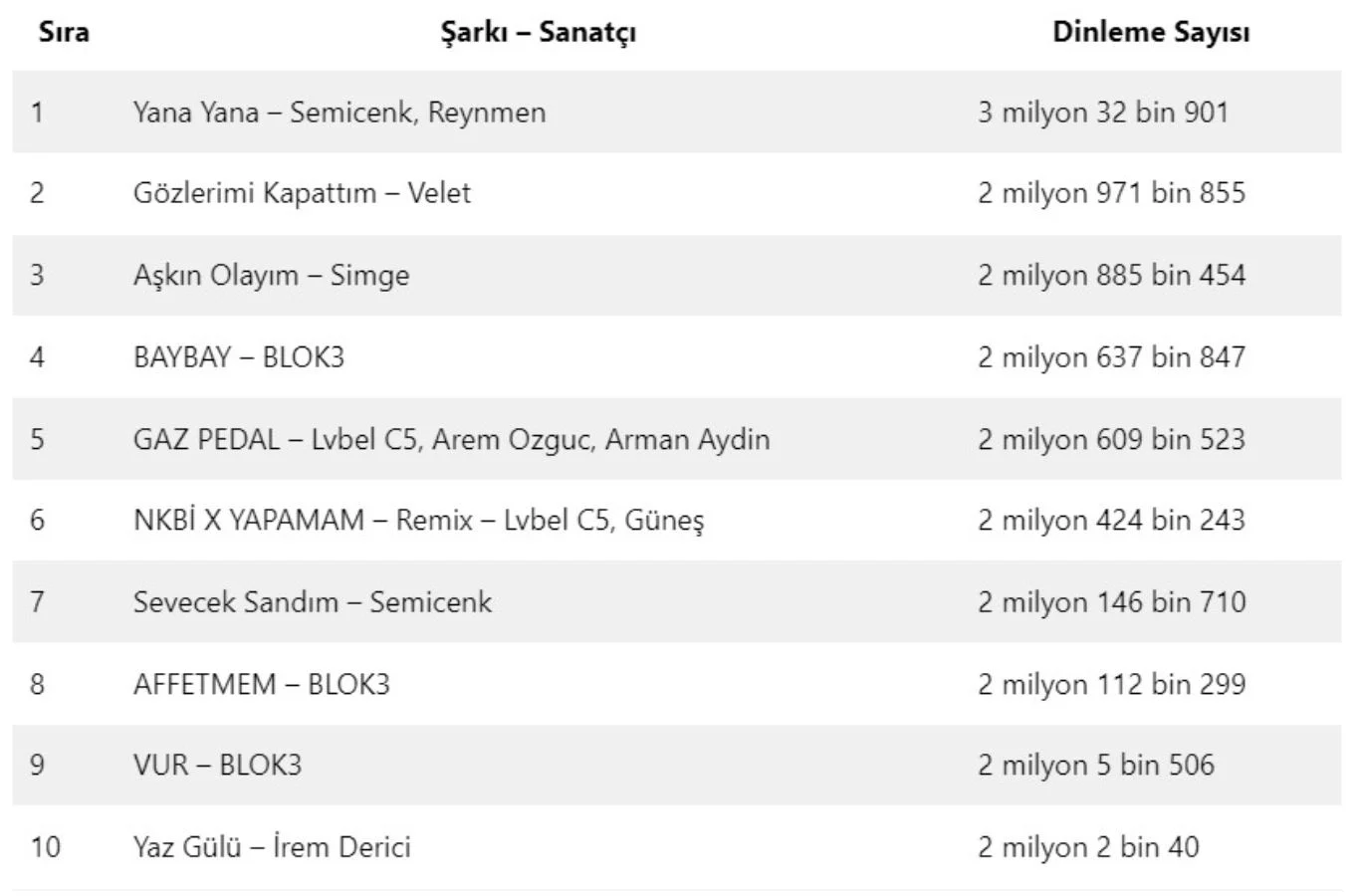 Shift Delete’nin haberine göre Spotify tarafından paylaşılan verilere göre Türkiye’de en popüler şarkı, Reynmen ve Semicenk’e ait “Yana Yana” parçası oldu. Parça, 3 milyondan fazla dinlendi. Öte yandan hemen ardından ise onu Velet tarafından söylenen “Gözlerimi Kapattım” takip etti.