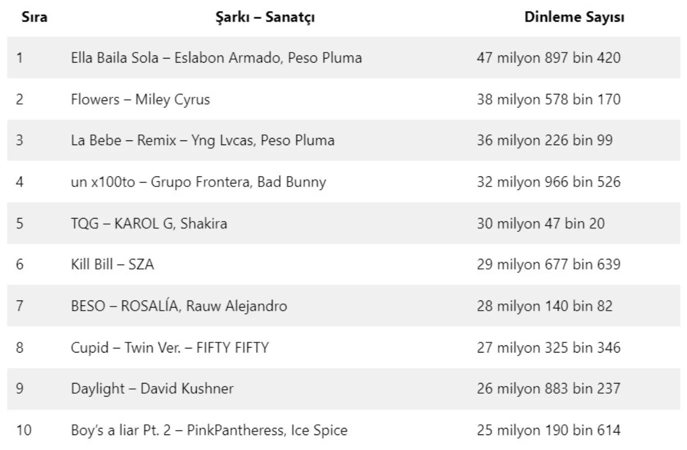 Spotify, Türkiye bir yana dünya genelindeki en popüler parçaları da açıkladı. Buna göre en çok dinlenen global şarkı, “Ella Baila Sola” oldu. Eslabon Armado ve Peso Pluma tarafından yayımlanan parça, toplamda neredeyse 48 milyon kez dinlendi.