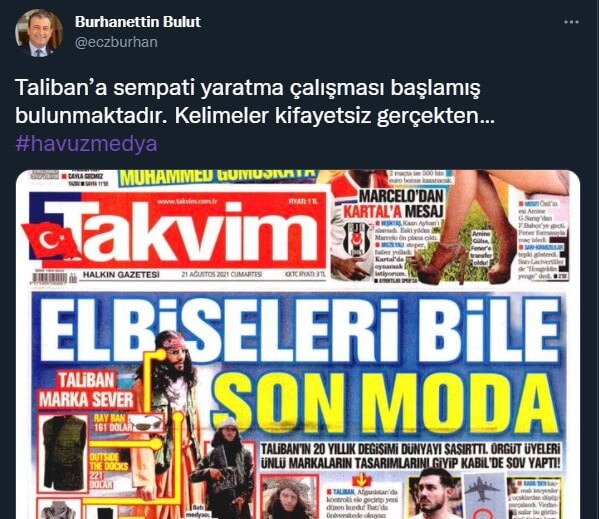 Bulut, Takvim’in manşetine “Taliban’a sempati yaratma çalışması başlamış bulunmaktadır. Kelimeler kifayetsiz gerçekten… #havuzmedya” sözleriyle tepki gösterdi.