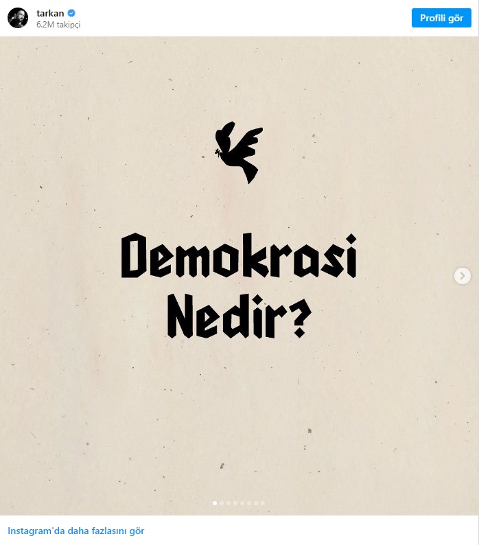 Bu kez Tarkan’dan dikkat çeken başka bir paylaşım daha geldi. Tarkan, Instagram hesabından Demokrasi paylaşımı yaptı. “Demokrasi nedir?” sorusuyla başlayan paylaşımda şu ifadeler yer aldı: