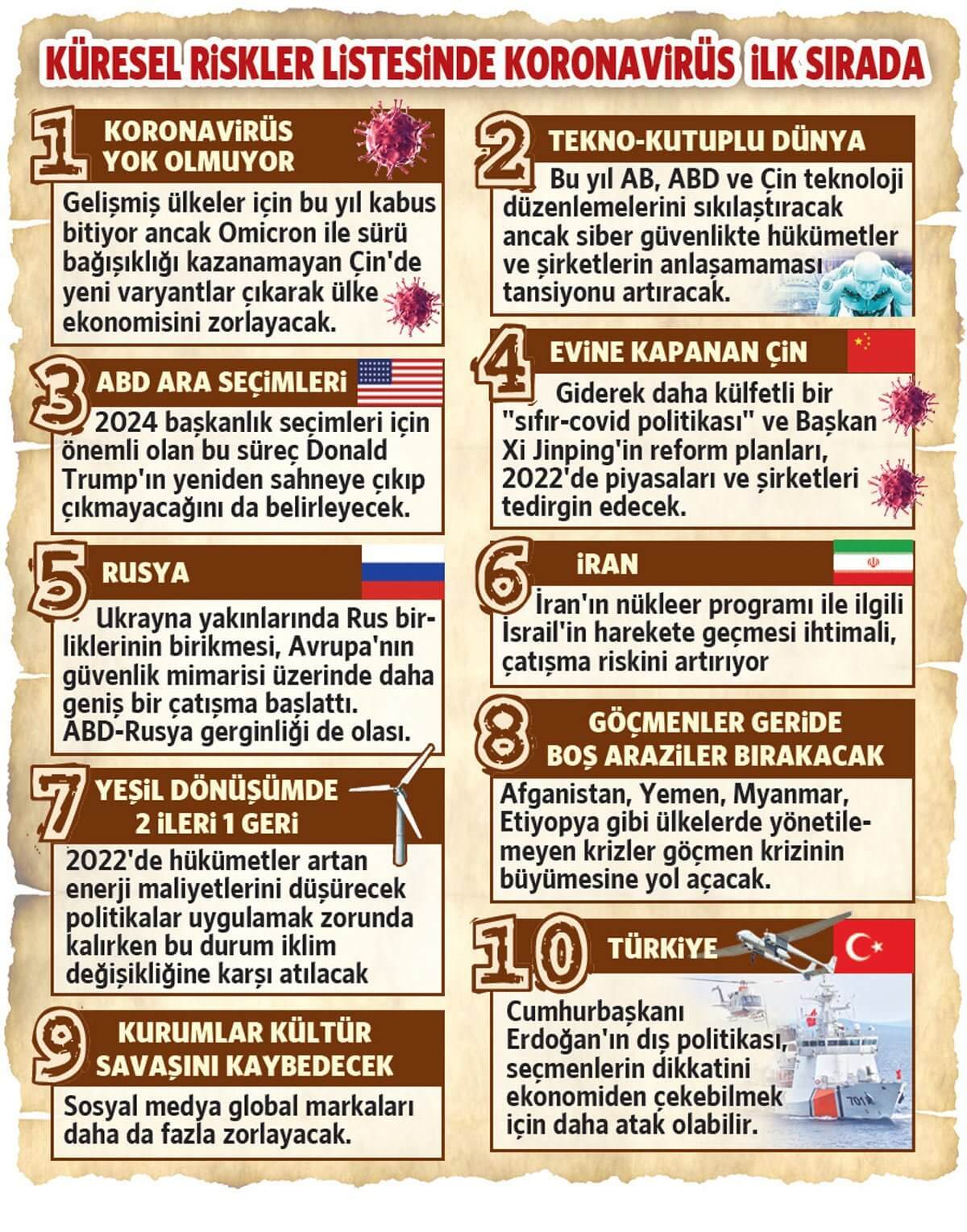 Sözcü’den Özlem Ermiş Beyhan’ın aktardığına göre Time dergisinin her yıl geleneksel olarak yıl başında yaptığı sıralamada, o yıl dikkatle izlenmesi gereken global risklere işaret ediliyor. Dergi 2022 için Türkiye’ye listede 10’uncu sırada yer verirken Türkiye ile ilgili şu analizi aktardı: