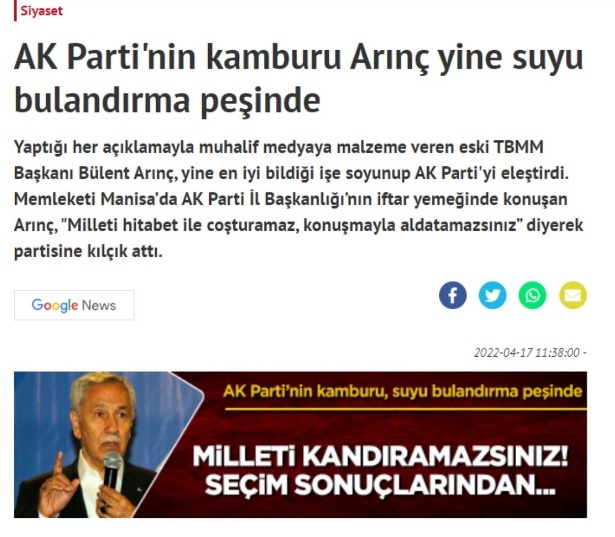 “Yaptığı her açıklamayla muhalif medyaya malzeme veren eski TBMM Başkanı Bülent Arınç, yine en iyi bildiği işe soyunup AK Parti’yi eleştirdi. Memleketi Manisa’da AK Parti İl Başkanlığı’nın iftar yemeğinde konuşan Arınç, “Milleti hitabet ile coşturamaz, konuşmayla aldatamazsınız” diyerek partisine kılçık attı. Arınç, sorunların çözülmediği takdirde önümüzdeki seçimlerde partisinin başarılı olup olmayacağından emin olamadığını da söyledi.”