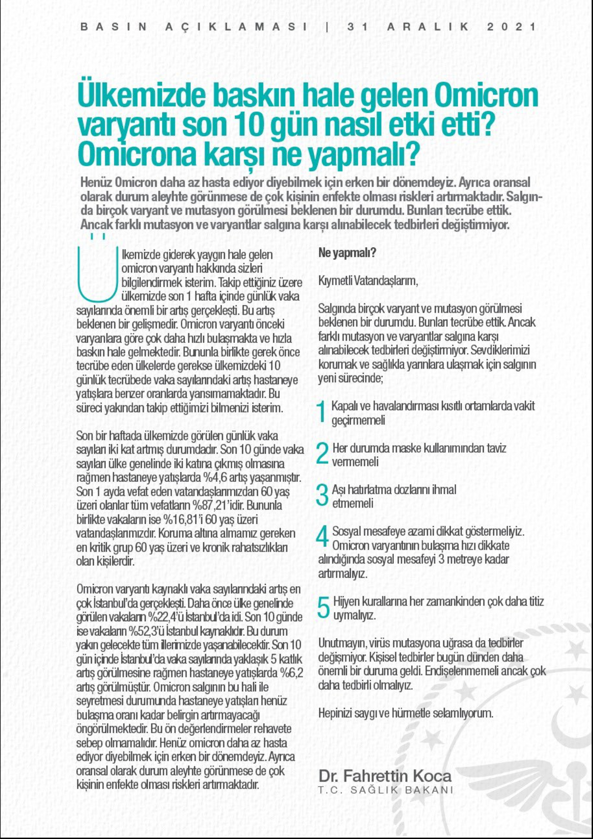 Sağlık Bakanı Fahrettin Koca, Türkiye’de de baskın hale gelen Omicron varyantına karşı ne yapılmasına ilişkin bir bilgi metni yayınladı.