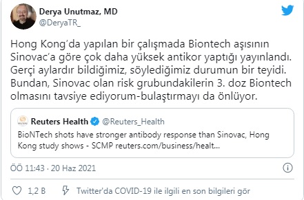 Prof. Dr. Derya Unutmaz sosyal medya hesabından yaptığı paylaşımda, “Hong Kong’da yapılan bir çalışmada Biontech aşısının Sinovac’a göre çok daha yüksek antikor yaptığı yayınlandı. Gerçi aylardır bildiğimiz, söylediğimiz durumun bir teyidi. Bundan, Sinovac olan risk grubundakilerin 3. doz Biontech olmasını tavsiye ediyorum-bulaştırmayı da önlüyor” ifadesini kullandı.