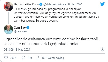 Boğaziçi Üniversitesi öğretim görevlisi Prof. Dr. Cem Say, Koca’nın Twitter’dan yaptığı açıklamaya “Öğrenciler de aşılanınca yüz yüze eğitime başlarız tabii. Üniversite nüfusunun ezici çoğunluğu onlar” yorumunu yaptı.