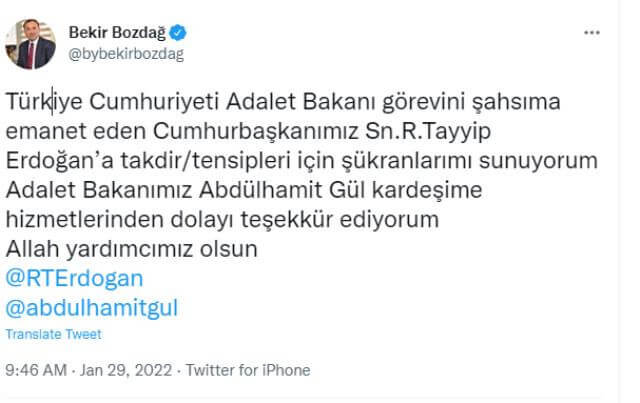 Gül’ün yerine Adalet Bakanlığı görevine getirilen Bekir Bozdağ da sosyal medya hesabından açıklamada bulundu. Bozdağ, “Türkiye Cumhuriyeti Adalet Bakanı görevini şahsıma emanet eden Cumhurbaşkanımız Sayın Recep Tayyip Erdoğan’a takdir/tensipleri için şükranlarımı sunuyorum. Adalet Bakanımız Abdülhamit Gül kardeşime hizmetlerinden dolayı teşekkür ediyorum. Allah yardımcımız olsun” diye konuştu.