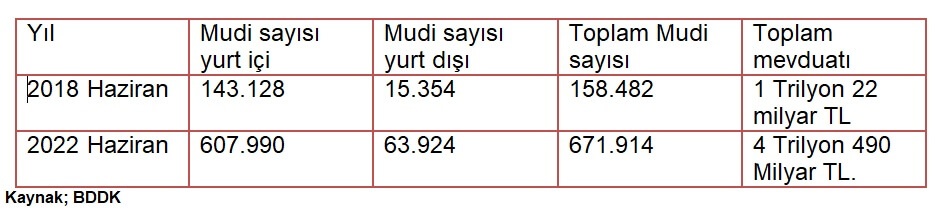 2018 Haziranında bankalarda 1 milyon TL ve üzeri hesaba sahip olan kişi sayısı 158 bin 482 kişi iken 2022 Haziran ayı itibariyle bu sayısı 671 bin 914 kişiye yükseldi. Resmi verilerde dahi 17 milyondan fazla kişi yoksulluk koşullarında yaşarken, asgari ücret açlık sınırının altında son 4 yıldır demir atmışken, tek adam sisteminin 4 yılı sonunda milyoner sayısı yüzde 323 oranında arttı.