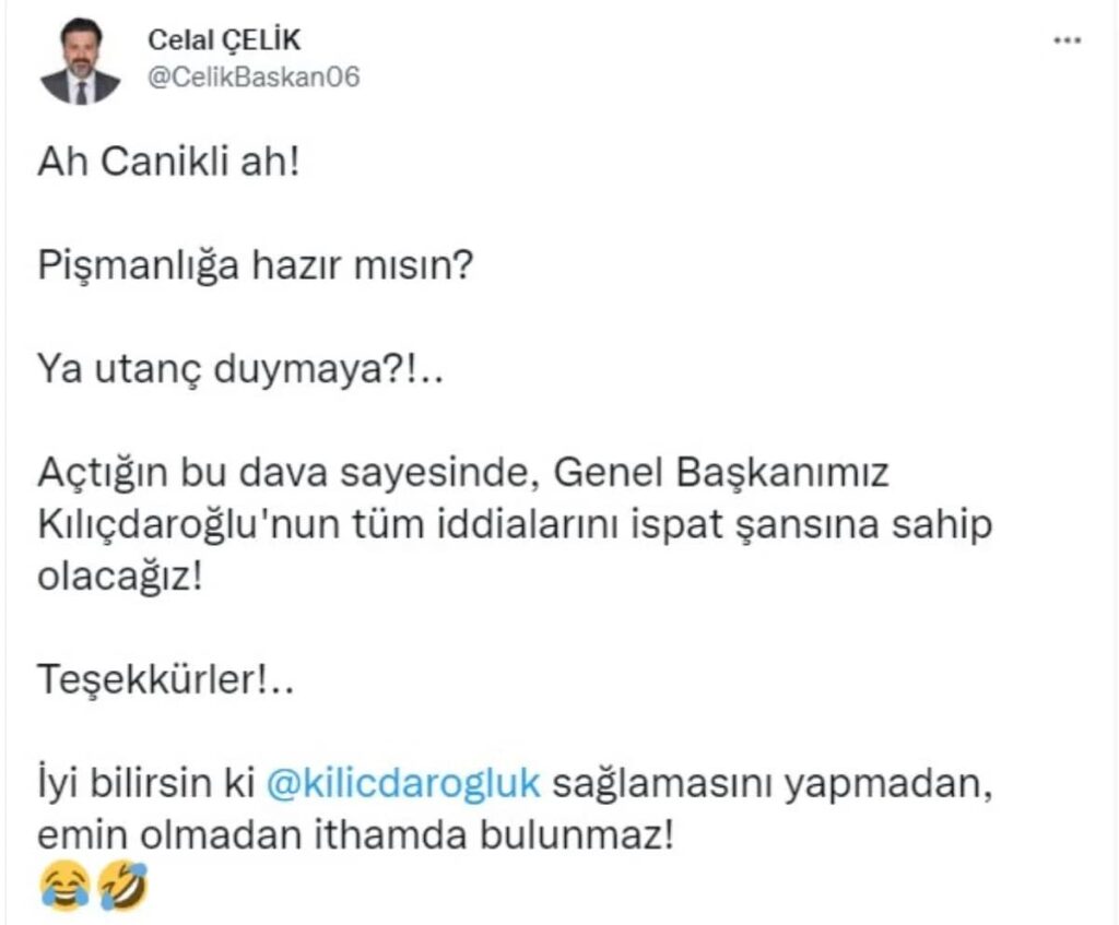 Çelik Twitter paylaşımında, “Ah Canikli ah! Pişmanlığa hazır mısın? Ya utanç duymaya?!.. Açtığın bu dava sayesinde, Genel Başkanımız Kılıçdaroğlu’nun tüm iddialarını ispat şansına sahip olacağız Teşekkürler!.. İyi bilirsin ki Kılıçdaroğlu, sağlamasını yapmadan, emin olmadan ithamda bulunmaz!” ifadelerini kullandı.