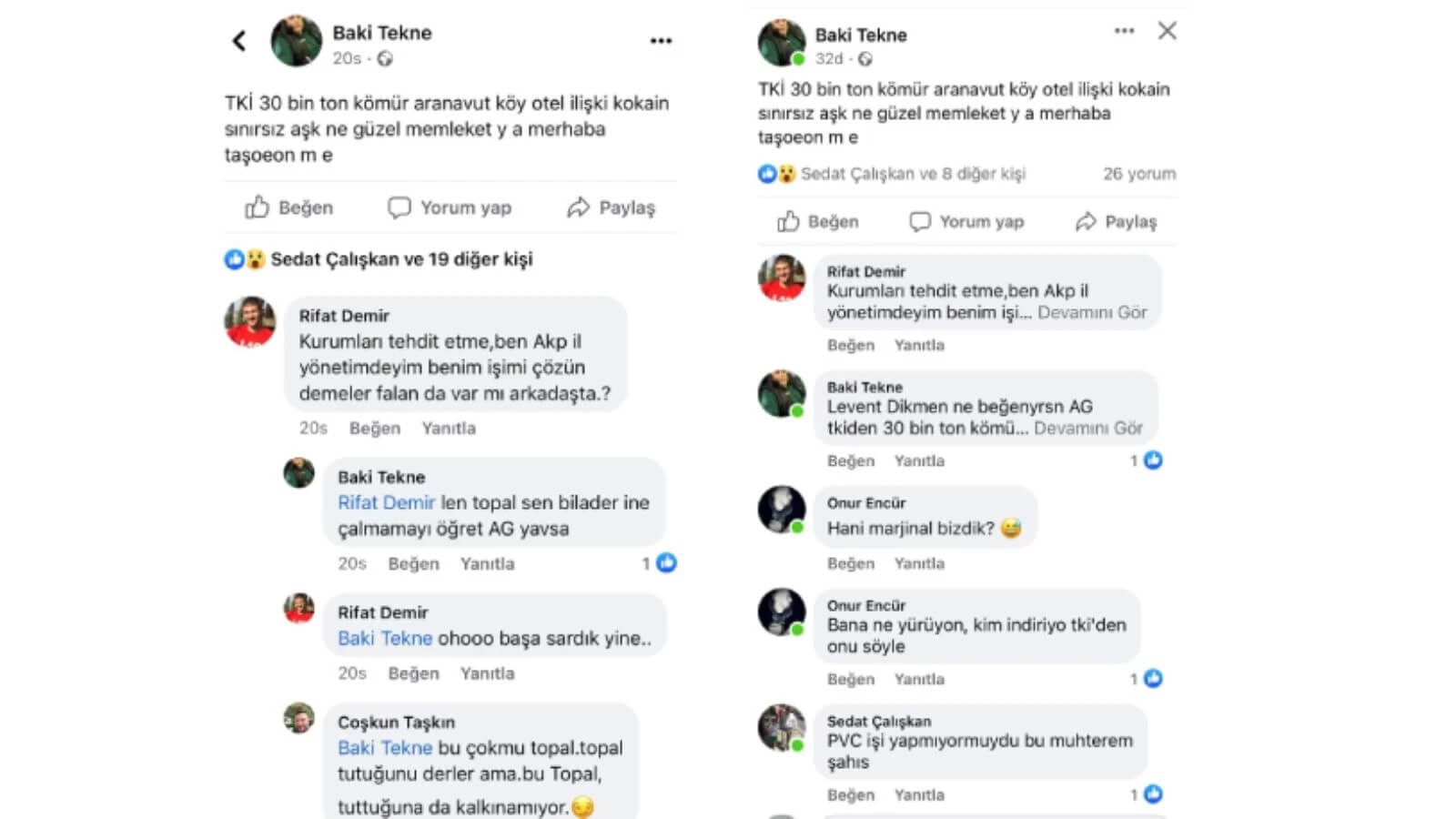 AKP Çan İlçe Teşkilatı’ndan Baki Tekne adlı kişi, sosyal medya hesabından, “TKİ 30 bin ton kömür, Arnavut köy, otel, ilişki, kokain, sınırsız aşk ne güzel memleket ya. Merhaba taşeron M.E” açıklamasında bulundu.