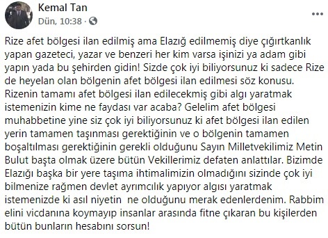 Cumhurbaşkanı Recep Tayyip Erdoğan’ın Rize’de sel felaketinden etkilenen alanların afet bölgesi ilan edileceğini duyurmasının ardından, Elazığ’daki 6.8’lik deprem nedeniyle kentin afet bölgesi ilan edilmemesini eleştiren gazetecileri hedef alan Tan, gazetecilere yönelik, “Rize afet bölgesi ilan edilmiş ama Elazığ edilmemiş diye çığırtkanlık yapan gazeteci, yazar ve benzeri her kim varsa işinizi ya adam gibi yapın ya da bu şehirden gidin! Siz de çok iyi biliyorsunuz ki sadece Rize de heyelan olan bölgenin afet bölgesi ilan edilmesi söz konusu. Rize’nin tamamı afet bölgesi ilan edilecekmiş gibi algı yaratmak istemenizin kime ne faydası var acaba” dedi.