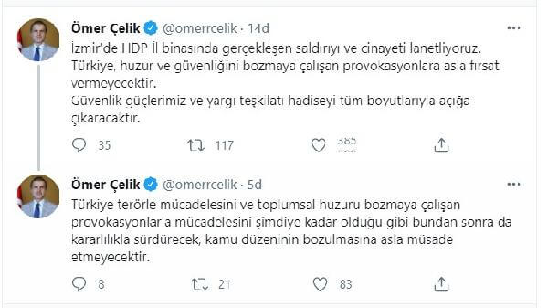 İzmir’de HDP İl binasında gerçekleşen saldırıyı ve cinayeti lanetliyoruz. Türkiye, huzur ve güvenliğini bozmaya çalışan provokasyonlara asla fırsat vermeyecektir. Güvenlik güçlerimiz ve yargı teşkilatı hadiseyi tüm boyutlarıyla açığa çıkaracaktır.