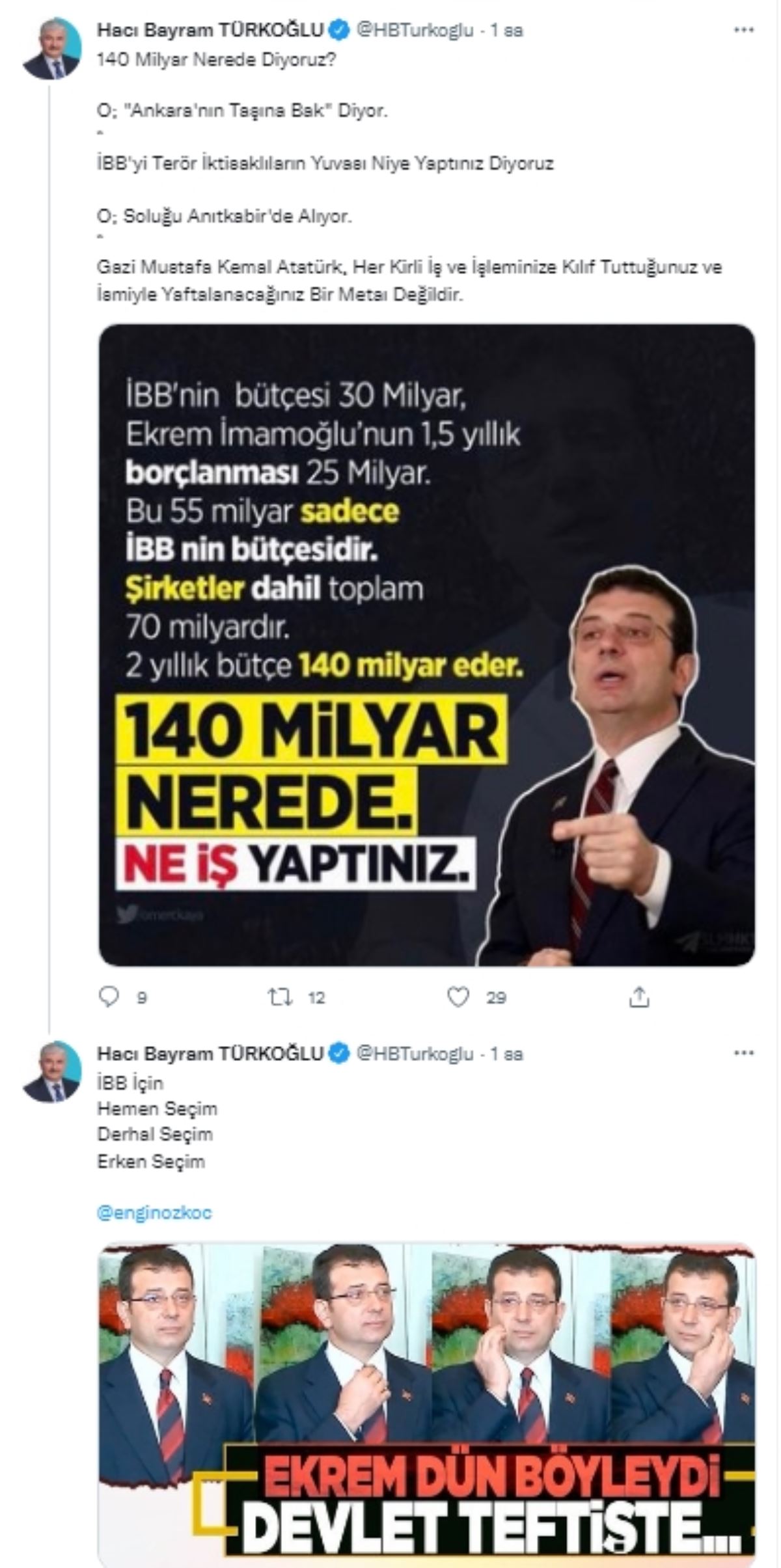AKP Merkez Karar Yönetme Kurulu (MKYK) Üyesi ve Hatay Milletvekili Hacı Bayram Türkoğlu, sosyal medya hesabından yaptığı açıklamada, İstanbul Büyükşehir Belediyesi için ‘hemen erken seçim’ talep etti.