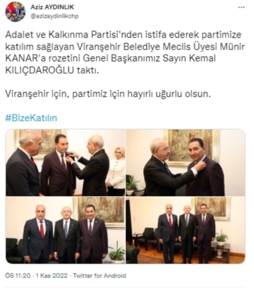“Adalet ve Kalkınma Partisi’nden istifa ederek partimize katılım sağlayan Viranşehir Belediye Meclis Üyesi Münir Kanar’a rozetini Genel Başkanımız Sayın Kemal Kılıçdaroğlu taktı.