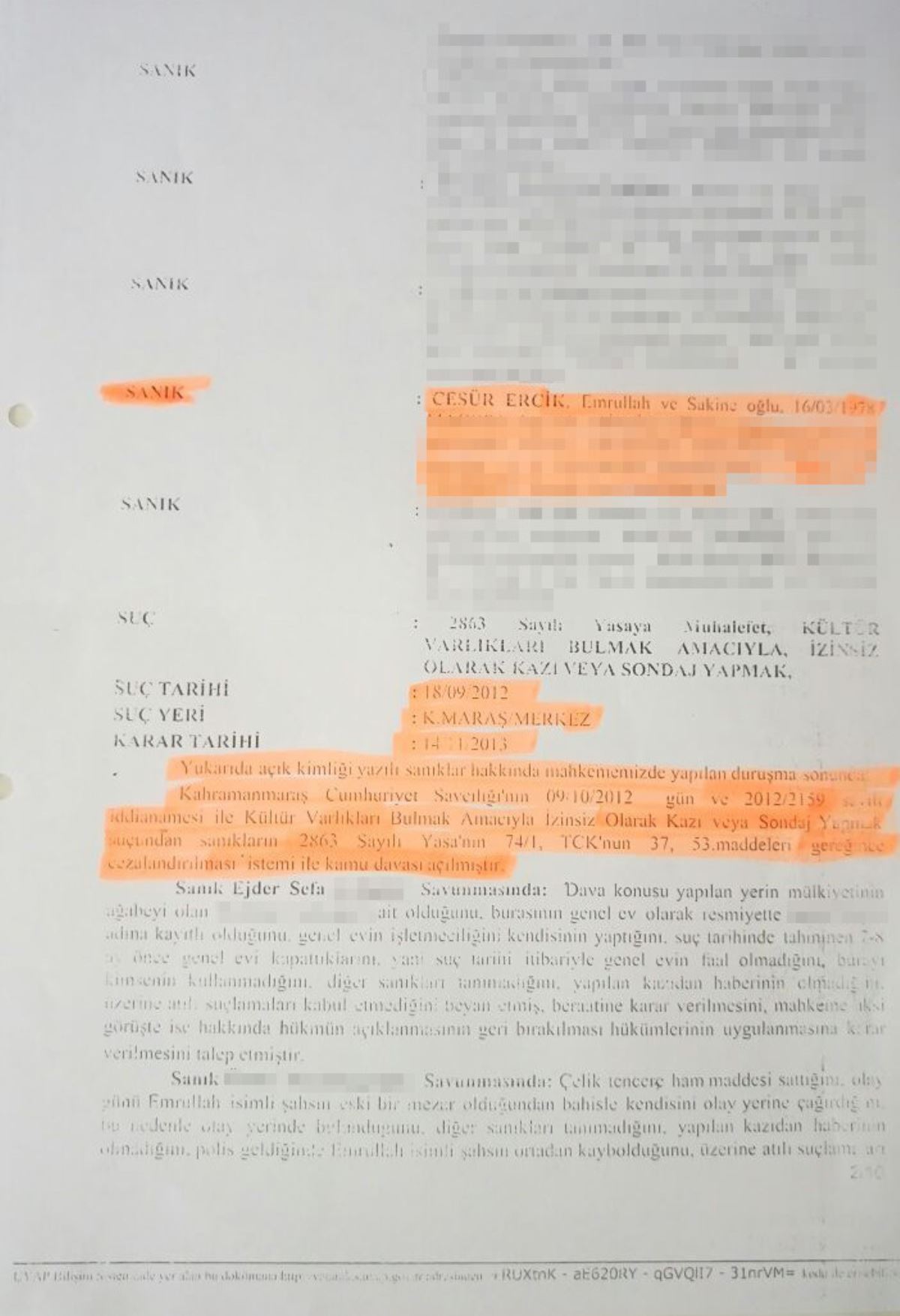 Emniyet güçlerinin yaptığı baskın sonrası ortaya çıkan kaçak kazı sonrasında Cumhuriyet Başsavcılığı Cesur Erck ve arkadaşlarını mahkemeye sevk etmiş, yapılan yargılama sonucunda da Cesur Ercik’in ‘Sit alanında kültür varlıklarını bulmak amacıyla izinsiz kazı yapmak suçundan 2 yıl hüküm giymesine karar verildiği ortaya çıktı. Ercik’in cezasının sabıkası olmamasından dolayı 1 yıl 8 aya indirildiği, suçun ise 5 yıl süre ile ertelendiği belirtildi.