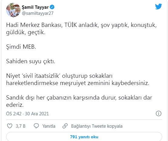 “Hadi Merkez Bankası, TÜİK anladık, şov yaptık, konuştuk, güldük, geçtik. Şimdi MEB. Sahiden suyu çıktı. Niyet ‘sivil itaatsizlik’ oluşturup sokakları hareketlendirmekse meşruiyet zeminini kaybedersiniz. Sandık dışı her çabanızın karşısında durur, sokakları dar ederiz.”