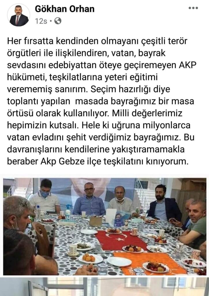 Seçim hazırlığı diye toplantı yapılan masada bayrağımız bir masa örtüsü olarak kullanılıyor. Milli değerlerimiz hepimizin kutsalı. Hele ki uğruna milyonlarca vatan evladını şehit verdiğimiz bayrağımız. Bu davranışlarını kendilerine yakıştıramamakla beraber AKP Gebze İlçe Teşkilatını kınıyorum” diyerek tepkisini dile getirdi.