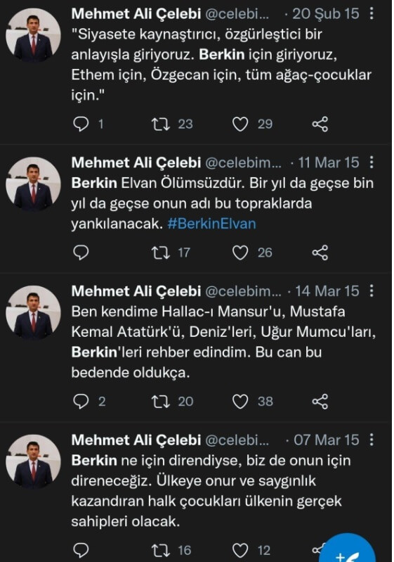 AKP’ye katılacağı iddia Çelebi, Gezi Parkı eylemleri sırasında polisin attığı biber gazı fişeğiyle başından vurulup 269 gün komada kaldıktan sonra 11 Mart 2014’te yaşamını yitiren Berkin Elvan’ın ardından attığı tweetlerini de sildi.