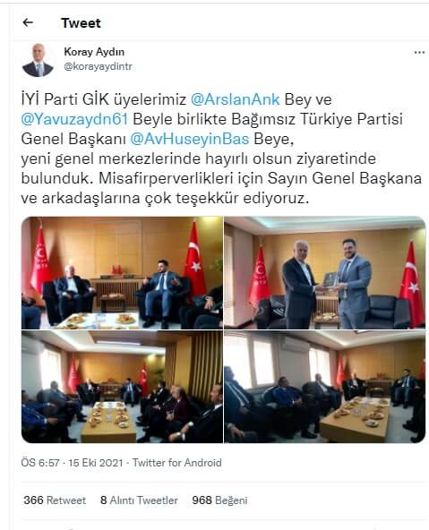 İYİ Parti Teşkilat Başkanı ve Ankara Milletvekili ziyareti “İYİ Parti GİK üyelerimiz @ArslanAnk Bey ve @Yavuzaydn61 Beyle birlikte Bağımsız Türkiye Partisi Genel Başkanı @AvHuseyinBas Beye, yeni genel merkezlerinde hayırlı olsun ziyaretinde bulunduk. Misafirperverlikleri için Sayın Genel Başkana ve arkadaşlarına çok teşekkür ediyoruz.” ifadeleriyle paylaştı.