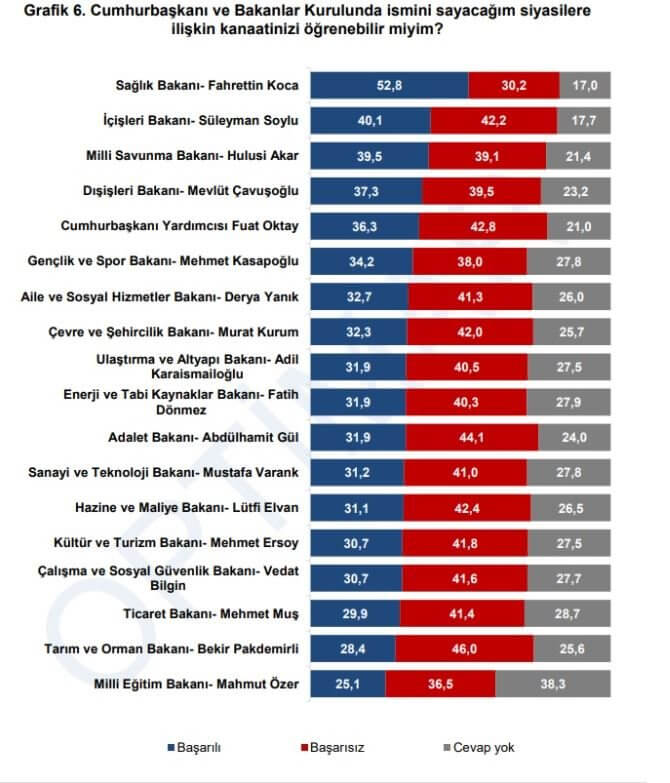 Ankette; Sağlık Bakanı Fahrettin Koca başarılı bulunurken, Süleyman Soylu, Mevlüt Çavuşoğlu, Mehmet Kasapoğlu, Derya Yanık, Murat Kurum, Adil Karaismailoğlu, Fatih Dönmez, Abdülhamit Gül, Mustafa Varank, Lütfi Elvan, Mehmet Ersoy, Vedat Bilgin, Mehmet Muş, Bekir Pakdemirli ve Mahmut Özer başarısız bulundu.