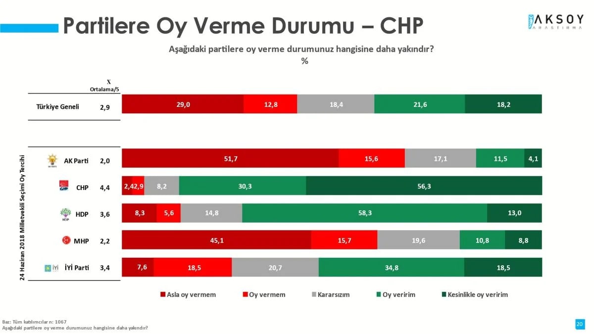 Görüldüğü üzere 100. yılına giden CHP’ye asla oy vermem diyenlerin oranı toplamda yüzde 41,8 iken 21. yılına giren AKP’ye asla oy vermem diyenlerin oranı yüzde 56,2. Keza 53. yılındaki MHP yüzde 61,2, 10. yılındaki HDP yüzde 79,5 ve 4. yılındaki İyi Parti yüzde 49,7 asla oy vermem diyen bir seçmen grubuna sahip. Aşırıya karşı makulün nasıl sonuç alacağına dair en iyi örneği sanırım bugünkü CHP oluşturuyor. Bugünkü diyorum çünkü 100. yılına giren partinin en düşük karşıtlığa sahip olması, bugünkü CHP yönetiminin büyük başarısıdır. İlk seçimin sonucunu belirleyecek en önemli unsurlardan birinin bu durum olduğuna inanıyorum.