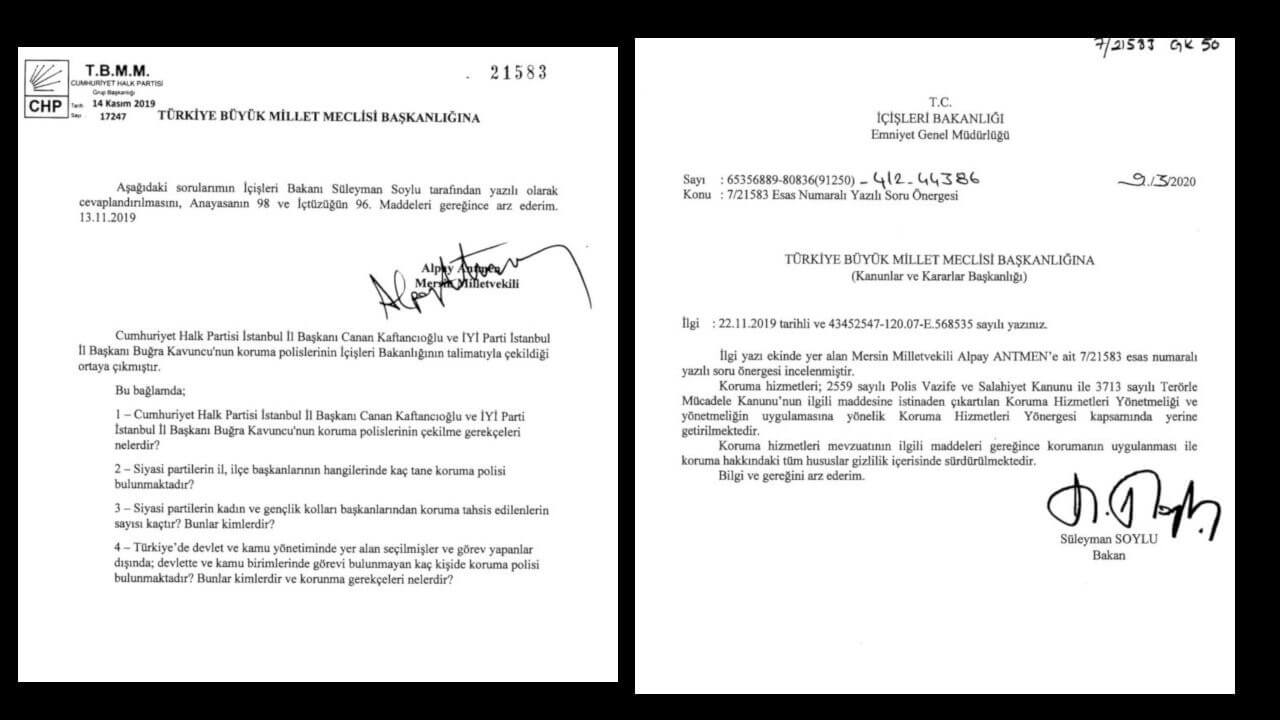 Sosyal medya hesabından açıklamalarda bulunan CHP’li Alpay Antmen, konuya ilişkin İçişleri Bakanı Soylu’ya verdiği soru önergesini hatırlattı. 2019’da İçişleri Bakanı Süleyman Soylu’ya, CHP İstanbul İl Başkanı Canan Kaftancıoğlu ve İYİ Parti İl Başkanı Buğra Kavuncu’nun korumalarının neden kaldırıldığının sorulduğu önergeye Süleyman Soylu, “Konunun gizliliği” yanıtını verdi.