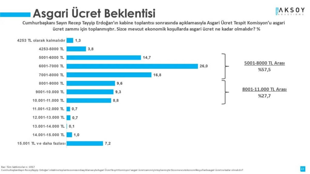 Erdoğan’ın kabine toplantısı sonrası asgari ücretin artacağını açıklaması ile birlikte iki hafta önce toplumun nasıl bir artış talep ettiğini anlamaya çalıştık. Yanıtları aşağıdaki gibi.